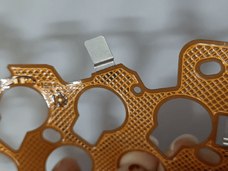 The flex PCB layout includes a designated mounting area where the nickel tab will attach. Engineers often design these areas with reinforced copper pads, additional plating thickness, and anchoring structures for mechanical bonding.